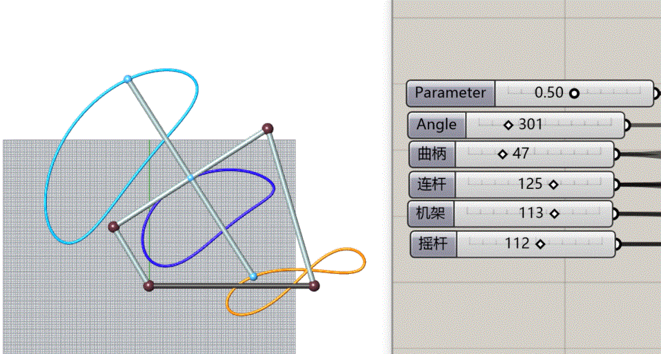 机构动态设计实例:在很多产品设计中都需要做机构设计,理想的机构设计方式应该是动态的。例如机器人手臂开发中需要的连杆曲线设计,用传统CAD绘图设计的方法做连杆曲线设计比较难,动态设计更难,需要大量的绘图工作,而通过按照规则编写的算法辅助设计就可以免去绘图,轻松实现动态设计。